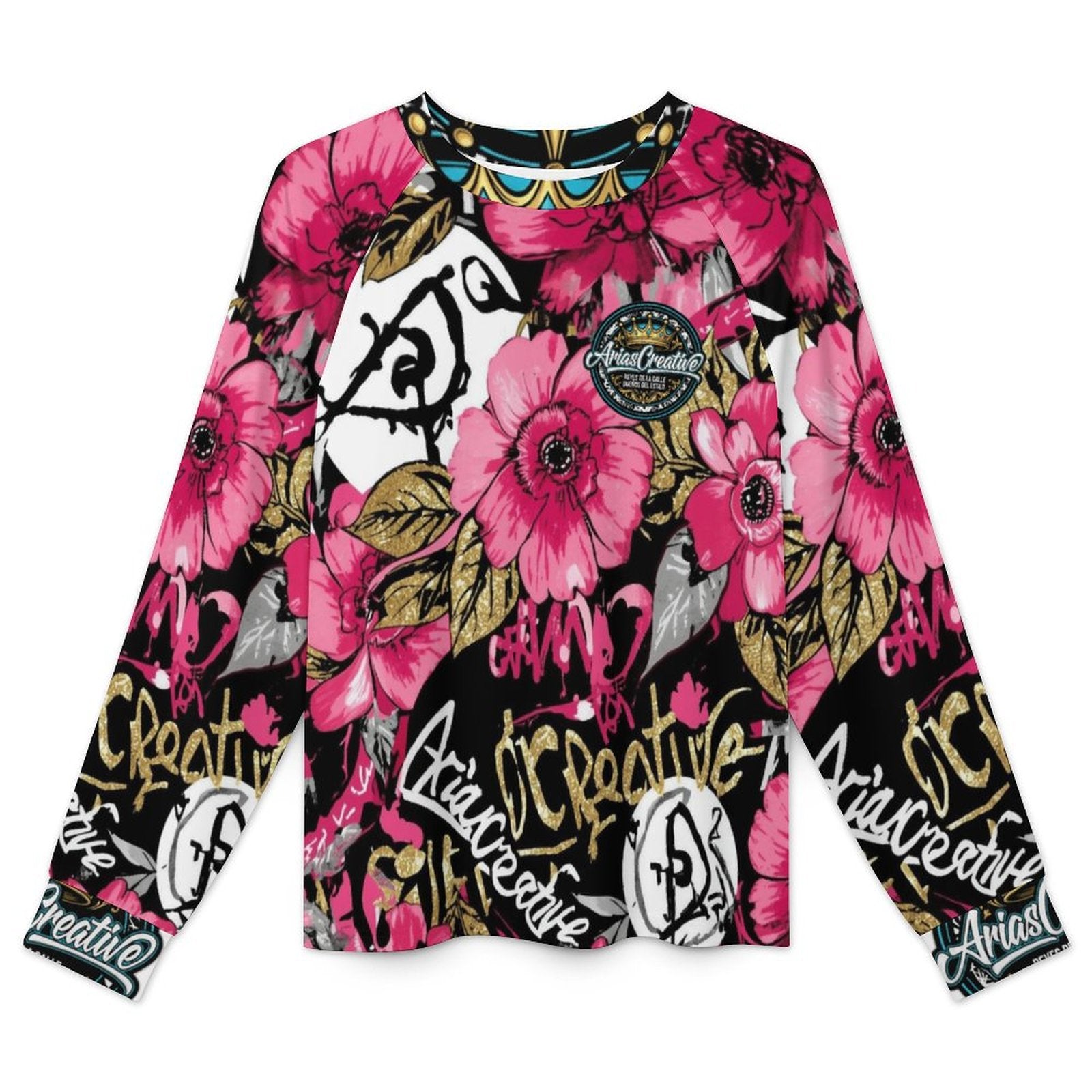 Eleva tu estilo con la Camiseta de Manga Larga Rápido Secado para Mujer AriasCreative Flores, diseñada con estampado completo de flores y el logotipo AriasCreative en el pecho.