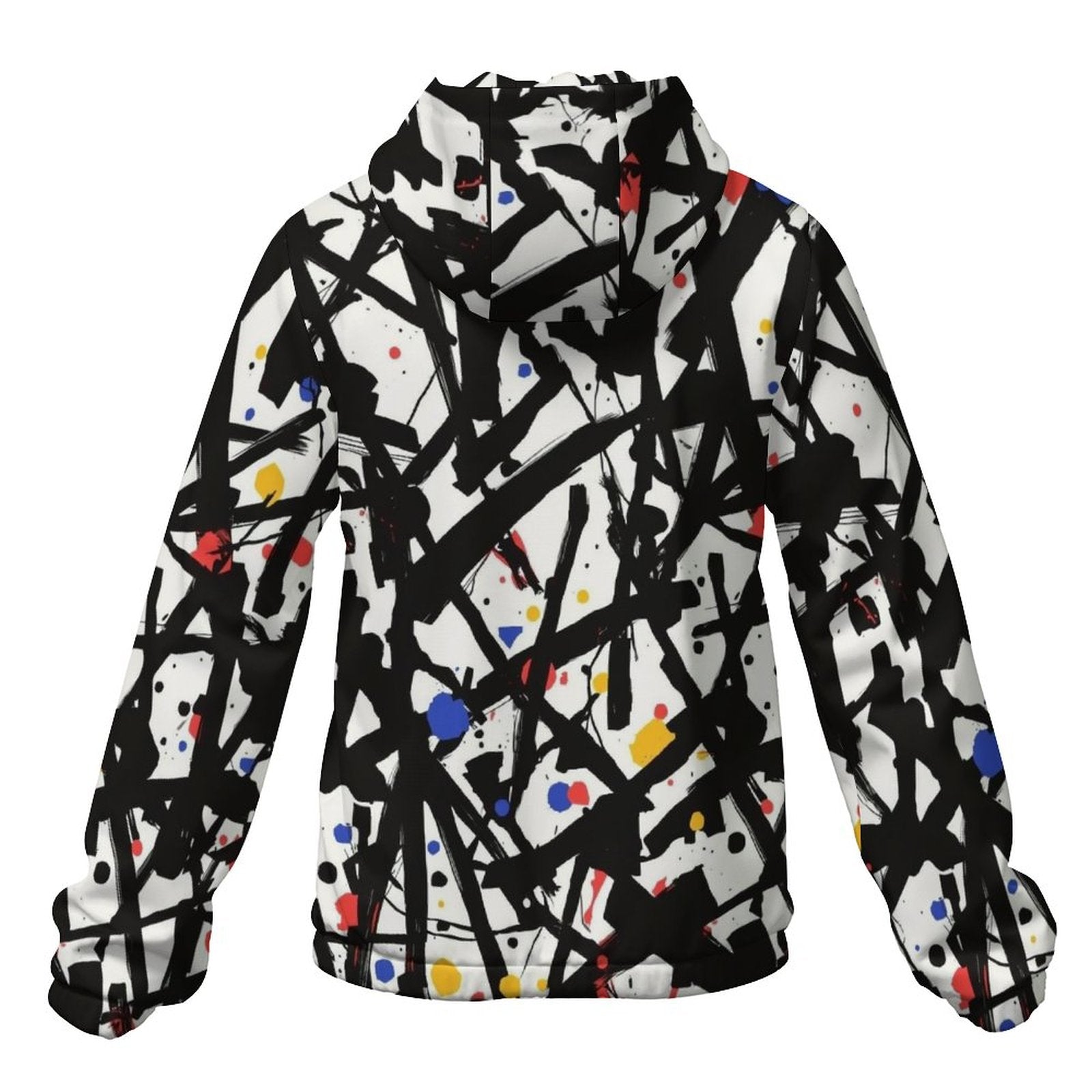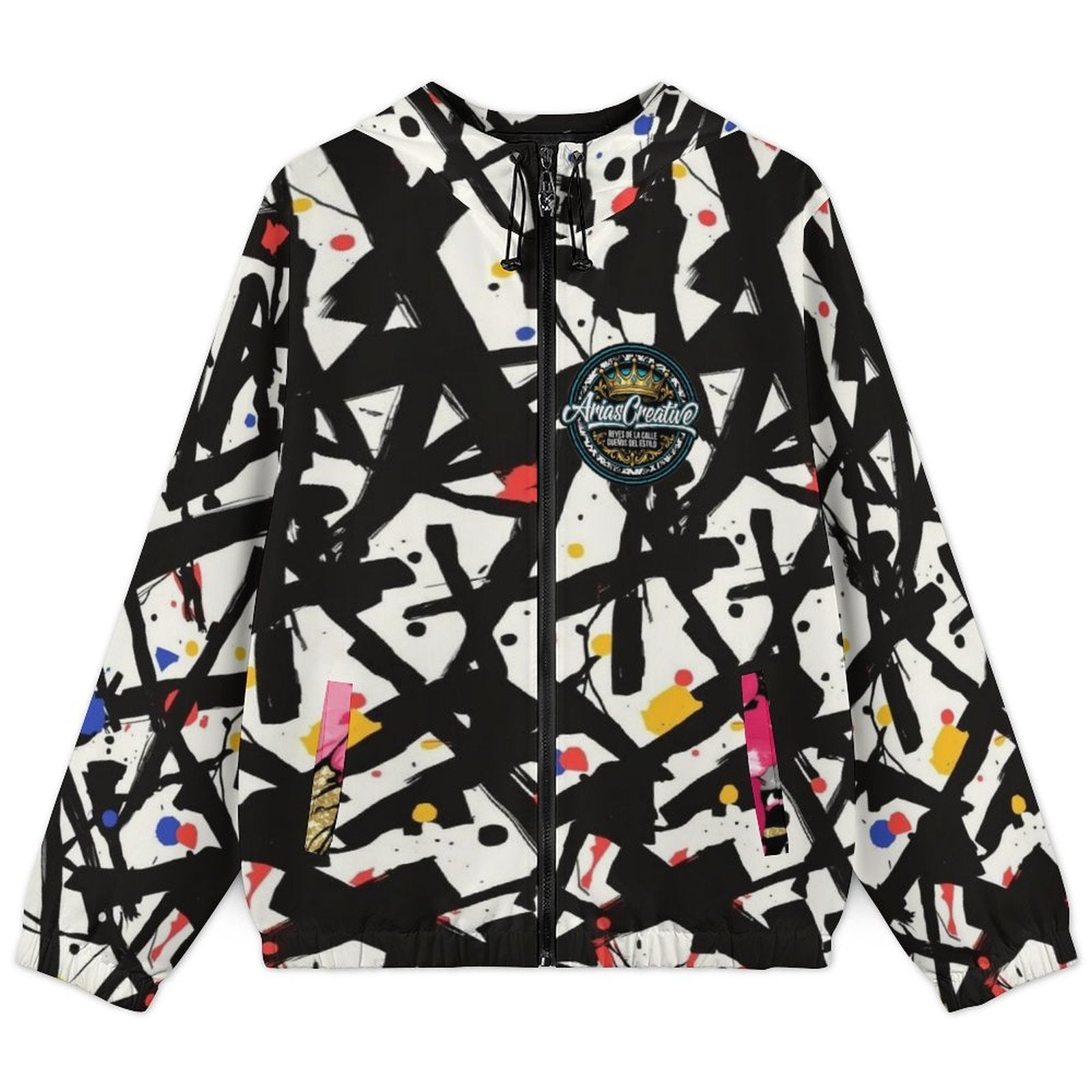 Luce un estilo audaz con la Cazadora Corta con Capucha AriasCreative, una prenda moderna con estampado completo en tonos negros, azules y rosa, que destaca por su diseño artístico y su sello distintivo AriasCreative en el pecho.