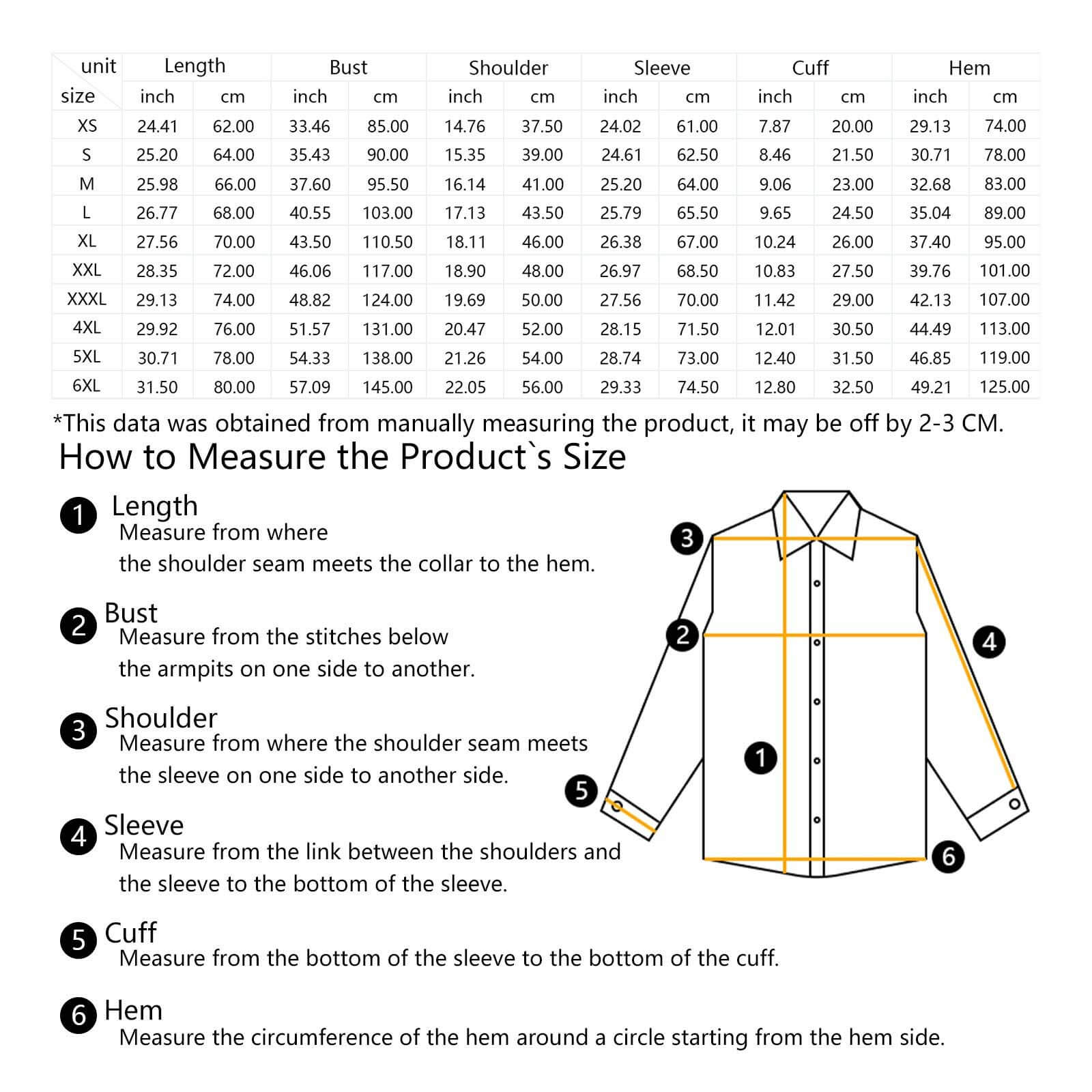 | 5XL | 78/30.71 | 138/54.33 | 54/21.26 | 73/28.74 | 31.5/12.40 | 119/46.85 |